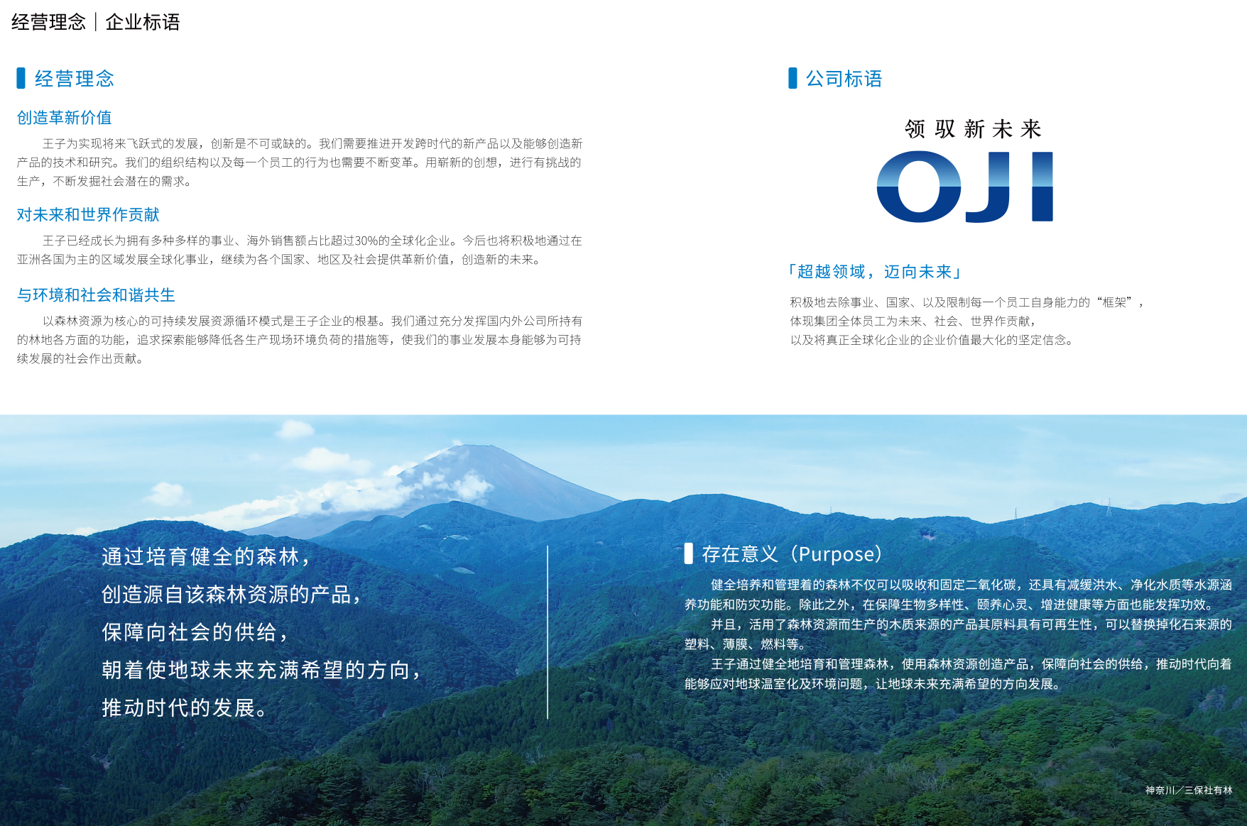 王子(OJI)最基本的企業(yè)理念體現(xiàn)在"論語(yǔ)與算盤(pán)",這是王子(OJI)創(chuàng)始人澀澤榮一所提出的,其含義為道德與經(jīng)濟(jì)相統(tǒng)一、倫理與利益相協(xié)調(diào)。王子(OJI)將這一精神融入"企業(yè)理念"和作為企業(yè)理念行動(dòng)方針的"王子(OJI)企業(yè)行動(dòng)憲章"。